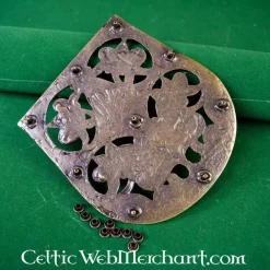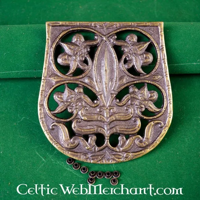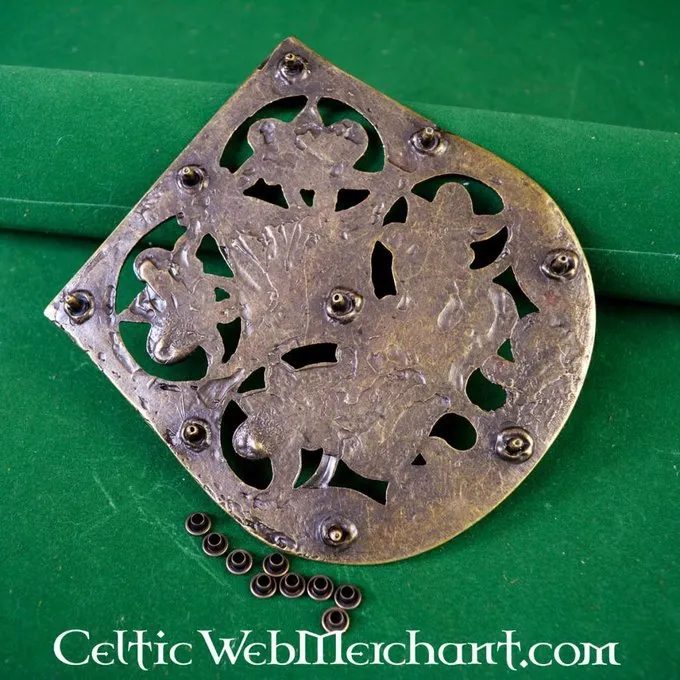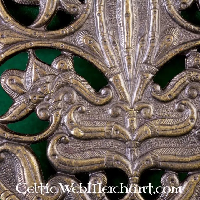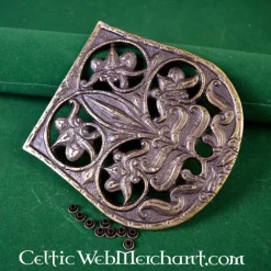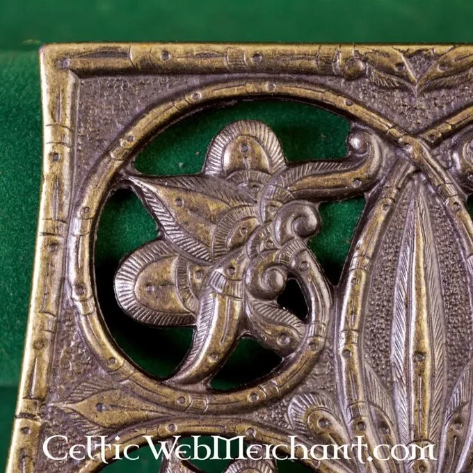 This luxurious bag decoration is a very detailed replica of the 9th-10th century original excavated in Karos-Eperjesszög (Hungary). This decorative plate completely covers de front of the bag, a style that was practised all over Europe around the 10th century.