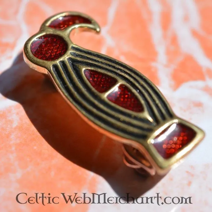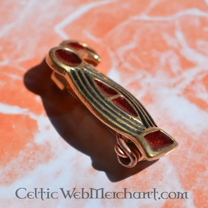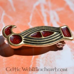 This fibula is made after a 6th-7th century Germanic original. The original is nowadays part of the collection of the Metropolitan Museum of Art in New York. Fibulae like this were worn all over Europe between the 5th and 7th century. They were worn by Germanic tribes like the Alemannnic people and the Franks, but also by the Merovingians and the Anglo-Saxons. This fibula was excavated from an Alemannic female grave. Presumably these fibulae were worn in sets of two. It is enameled with red glass.