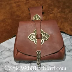 This bag is handmade of brown leather, it measures 18 x 23 cm and can be closed with a strap. The bag is decorated with motives in the art style of the Magyars, just like the original.