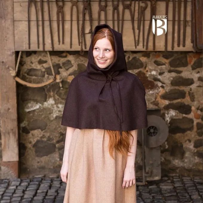 This chaperon is based on an original depicted in a medieval Book of Hours (daily prayer book) from approx. 1350 in the collection of the British Library. Chaperons like this were worn all over Europe. They protect the head and face from cold and rain. The manuscript illuminations show that this chaperon was even used for beekeeping! This chaperon ends in a long point over the back.