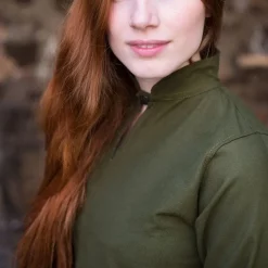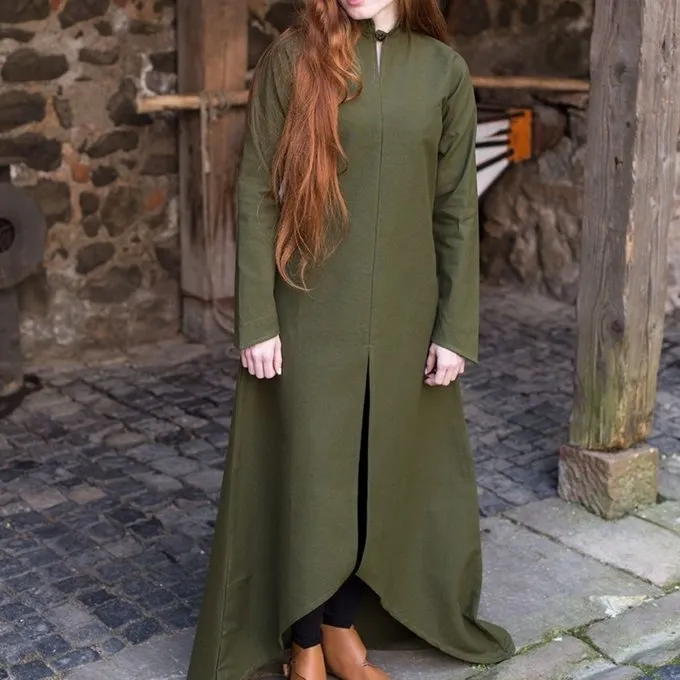 The dress Ranwen is a versatile design, a real eyecatcher. The dress has a collar that you can close with a button. The back of the skirt reaches to the ground and at the front it ends higher up. The front has a high split which makes the design very elegant. An exciting design that you can wear separately, but can also combine it with a corset, a skirt, a cloak or an overgarment. A garment that creates beautiful LARP, Cosplay and festival outfits.