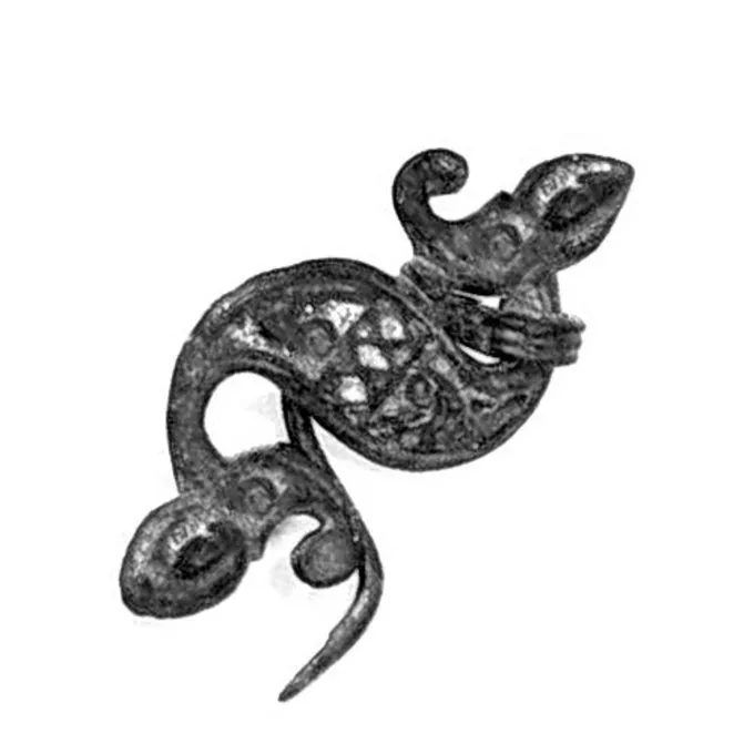 This bronze fibula is shaped like a styled seahorse. The shapes of this jewel frequently occur in Celtic earthenware and engravings from the Middle La Tène period.