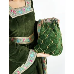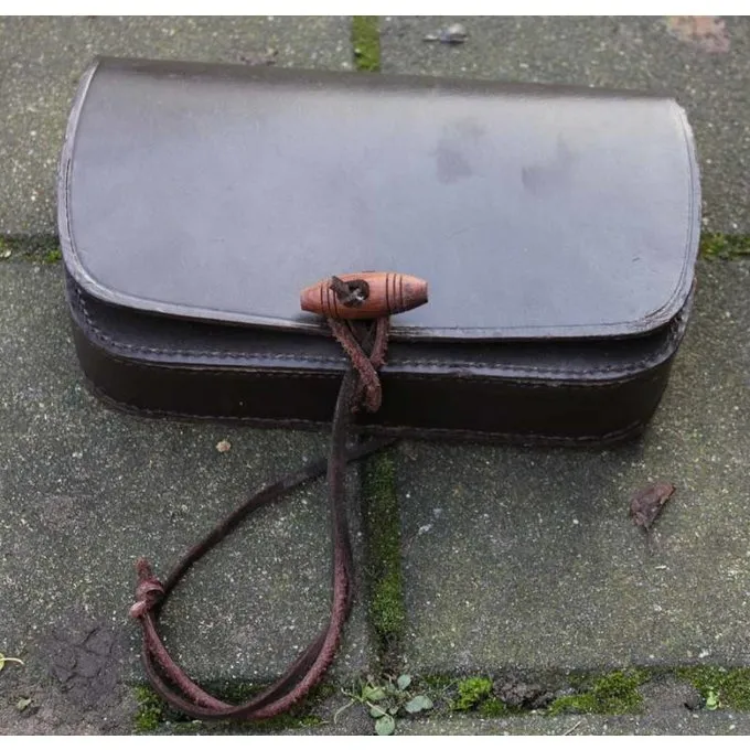 This bag is made of 4 mm thick dark brown cowhide. It has two loops at the back to hang it to the belt. It can be closed with a wooden button and a leather lace. The height of this bag is 15 cm, its width is 24 cm and its depth is approx. 5,5 cm.