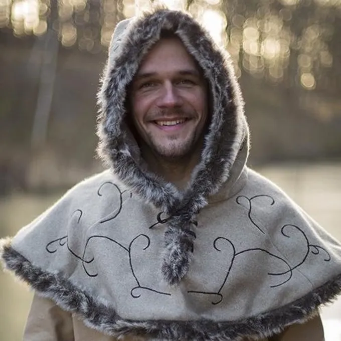 A wonderful warm hood for the winter months! This fantastic hood is made of wool mix and has a polyester faux fur trim. The hood is embroidered with a decorative pattern. It is very comfortable to wear with a soft cotton inner lining. The hood protects the shoulders against cold and rain. You can wear the hood over your back or over your head. The hood has a long back, this was the usual design for medieval chaperons. You can adjust the face opening and make it smaller or larger with leather laces. This versatile luxurious hood is a beautiful accessory for medieval re-enactment and various LARP and Cosplay characters.