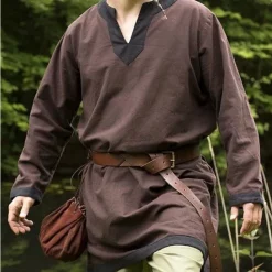 Tunics like this were basic garments worn by men all over Europe from the Early to Late Middle Ages. The tunic can be worn separately or as an undertunic with for example another tunic worn over it. In colder climates they were combined with trousers and leg wrappings.