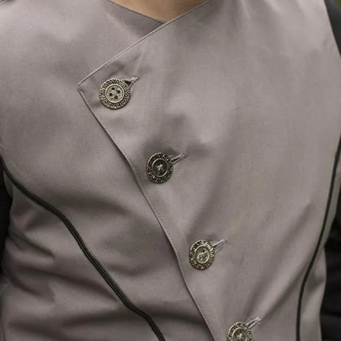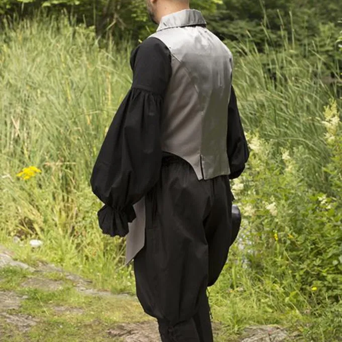 This beautiful asymmetrical vest is perfect for nineteenth century reenactment, LARP and steampunk. It is made in Victorian style and easy to combine with a shirt or dress to give your outfit extra allure. The top has a row of four buttons. You can choose to close all buttons or to open the collar. The collar has a grey satin lining so when opened, the grey color will show. The back also has a grey satin lining. This vest emphasizes the waist and runs to the knees. The front is longer than the back, which gives a fascinating and beautiful asymmetrical effect.