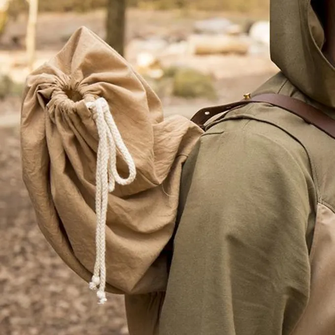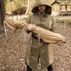 This bag is designed to store and carry items on your back like LARP and steel weapons and other re-enactment and LARP supplies such as clothing. It is particularly suitable for latex and steel swords, but also for axes, small bows and the like. It is made of cotton and has a leather reinforcement at the bottom. It is equipped with a high quality leather brown belt that you can wear over your shoulders and back. The bag has three laces on the outside, which you can draw to prevent the contents from shifting.