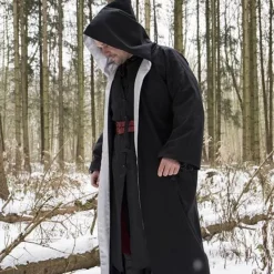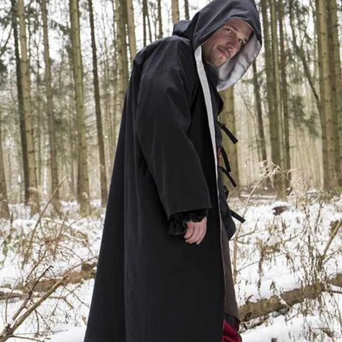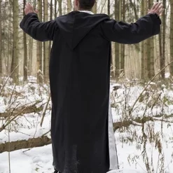 This robe is perfect for LARP and Cosplay of magical characters. The robe has long wide sleeves and a large hood. The inside of the hood and the inner lining are trimmed with silver-colored satin.