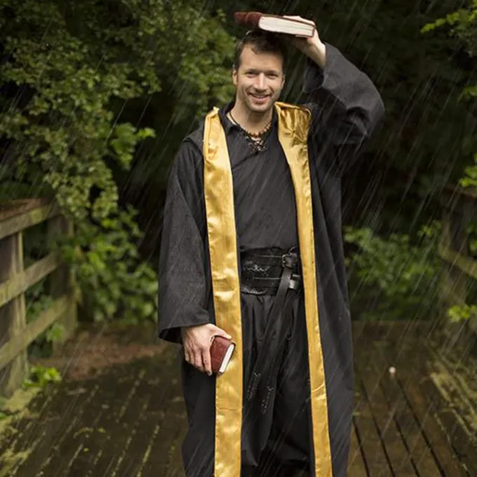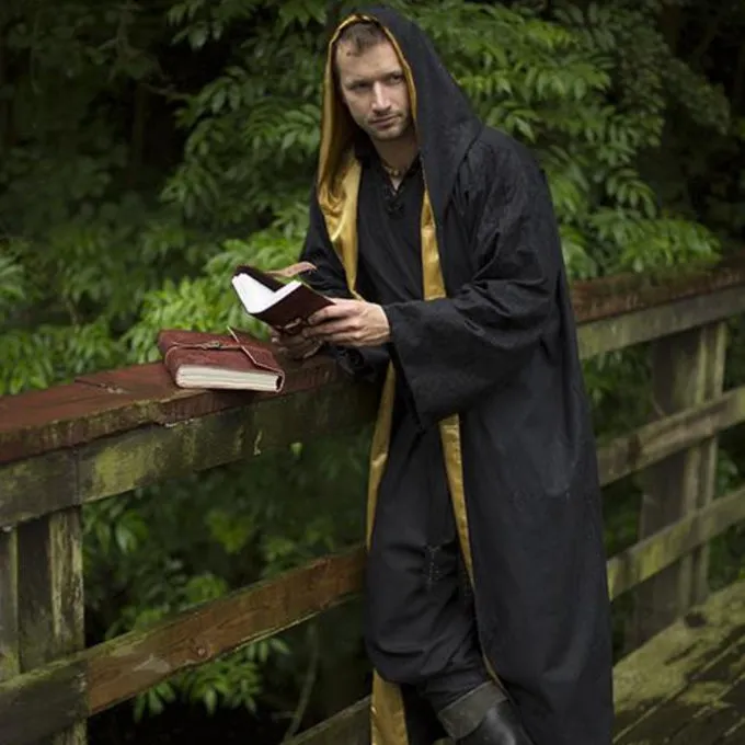 This robe is perfect for LARP and Cosplay of magical characters. The robe has long wide sleeves and a large hood. The inside of the hood and the inner lining are trimmed with yellow-colored satin.