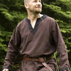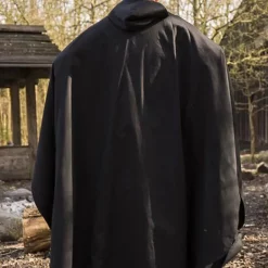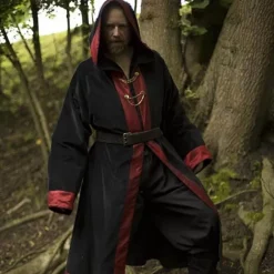 This garment is perfect for LARP and Cosplay of wizards, for example characters from the Harry Potter world. The robe has long wide sleeves and a large hood. The edges are decorated with a colored seam. You can fasten the robe with two golden colored chains between two rows of buttons. The robe has a very luxurious appearance because it is made of velours, which is very similar in structure to the expensive velvet fabric. The colored seams are made of polyester, but resemble an expensive brocate fabric.