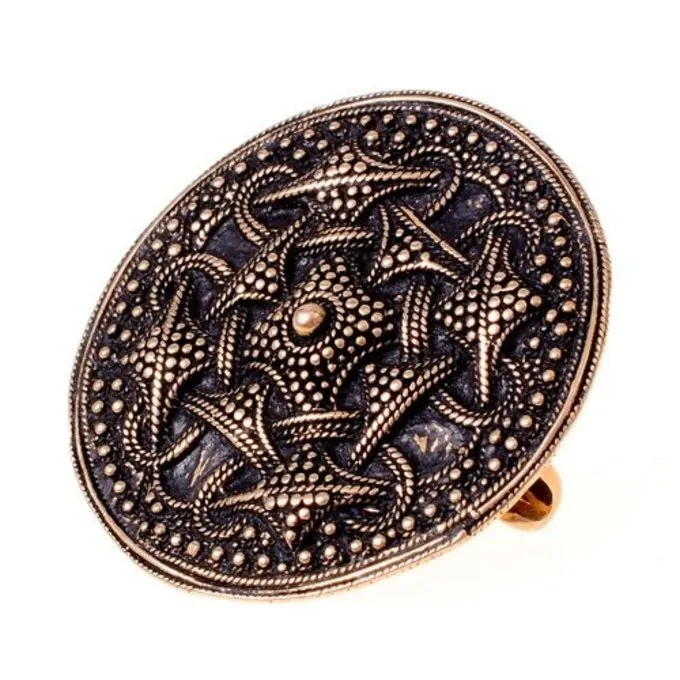 This disc fibula is a replica of a 10th century original excavated in Hiddensee. This disc fibula is made in the Terlslev style. The original is granulated, each dot on the fibula is soldered by hand. This cheaper replica is semi-granulated, which means that it is cast in one piece.