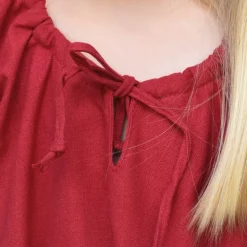 Dresses like this were worn during the Middle Ages as an underdress during the colder months, or as a regular dress in the summer. The sleeves and neck have cords to adjust the dress to your size. With these cords, you can also create a light puffed sleeve effect. You can wear the dress separately or under another color dress or combine it with an apron. To determine the size, measure the child’s body height. With a body height of 128 cm, size 128 is the best option.