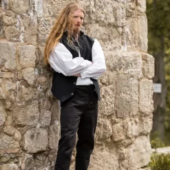 This vest is based on 16th-17th century originals. Vests like this were worn since the Tudor era at the time of the Spanish Armada, during the Spanish Succession War and the Pirate era. It protected the body from cold weather but did not limit the movement of the arms so they were very practical and popular amongst laborers and sailors. This vest is made of 100% cotton. It is available in the colors black and dark brown.