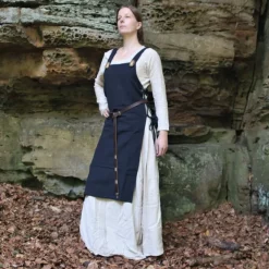 This elegant medieval style dress has a hoodie for keeping you warm, perfect for winter festivals! The side of the dress has cords for adjusting. The most striking elements of this dress are the beautifully draped black and red sleeves.