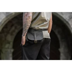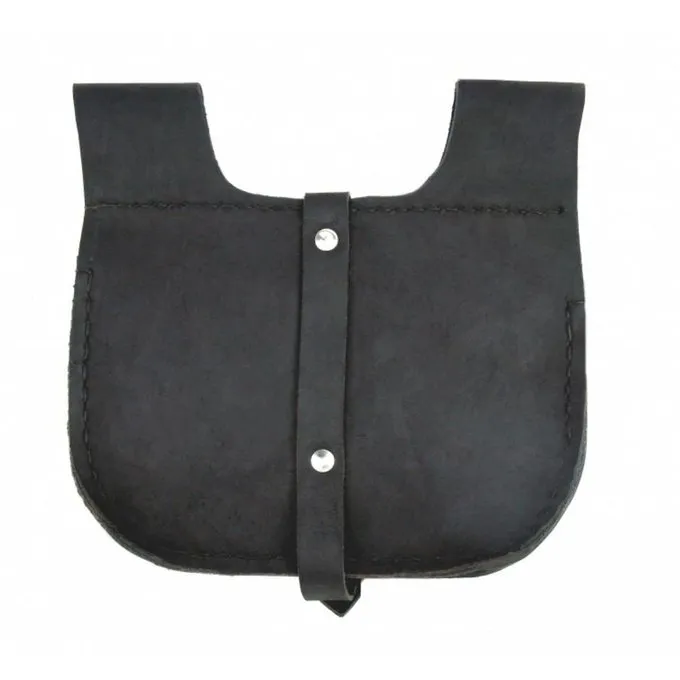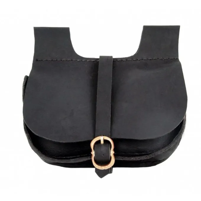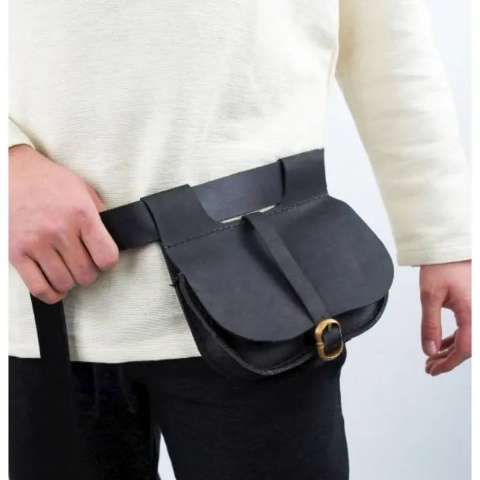 This model of kidney pouch is typical for the 15th century. It is made of genuine nubuck-leather and has a brass buckle for closing. At the top it has two belt loops which are suitable for belts up to 4 cm wide.