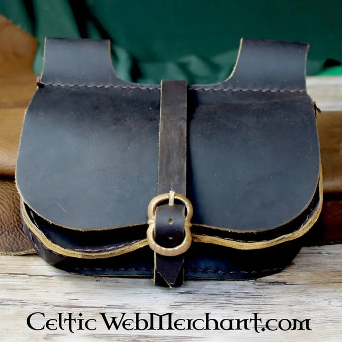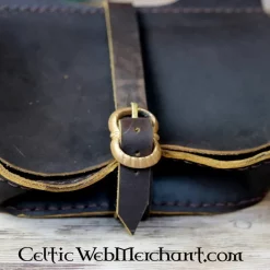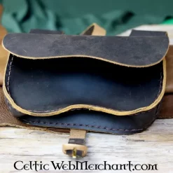 This model of kidney pouch is typical for the 15th century. It is made of genuine nubuck-leather and has a brass buckle for closing. At the top it has two belt loops which are suitable for belts up to 4 cm wide.