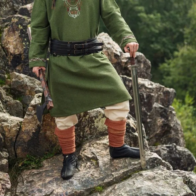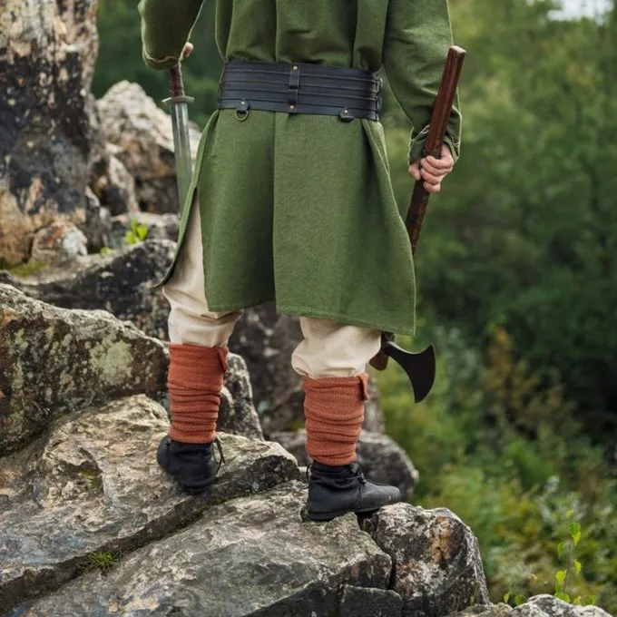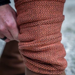 In the cold Viking climates of the north, leg wraps were used over the trousers. This keeps the legs extra warm on cold days. Winingas can be wrapped around your legs from knee to ankle and fastened with a fibula. Perfect for historical Viking costumes, LARP, Cosplay and reenactment. These leg wrappings have a historic herringbone pattern and are made of strong cotton. They are delivered in pairs and are 3.5 meters long.
