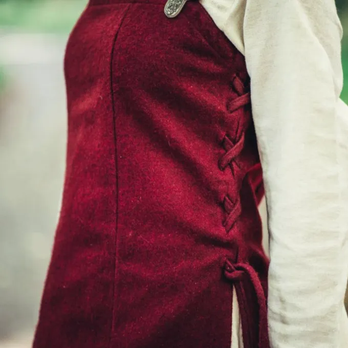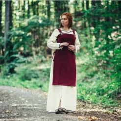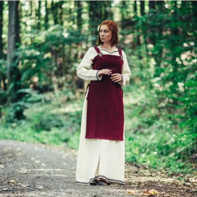 The hangeroc was a type of dress that Vikings and other early medieval European cultures wore over a slip dress. Viking women wore a hangeroc and slip dress in contrasting colors. Wealthy Viking women wore colors such as red with blue or purple, these were colors that were expensive to make so could only be worn by the higher classes of society. Lower class Vikings wore colors such as brown with yellow, cream with green, and similar colors that were less expensive to make. This replica hangeroc is made of wool mix and nice and warm for the winter months. The hangeroc is open on the sides, you can tie it with the laces on the side.