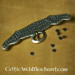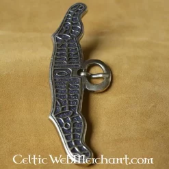 This bag fitting is a replica of a 6th century original excavated in Elgg, Switzerland. The original is excavated in grave 193, a male grave. The bag fitting has a buckle and ends in two horse heads. The bag fitting is completely made of brass and measures 15 x 5 cm.