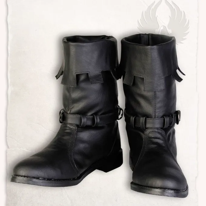 These Mytholon boots are great for LARP and medieval style reenactment costumes. These boots have a very nice design with edges in late medieval style. Hoods and other items of clothing from this era often feature such patterns. You can also find images of this in medieval manuscripts. The boots are made of synthetic leather so they are virtually waterproof. The inside is lined with foam, which keeps feet warm and dry. The heels and the front of the shoe are extra strong.