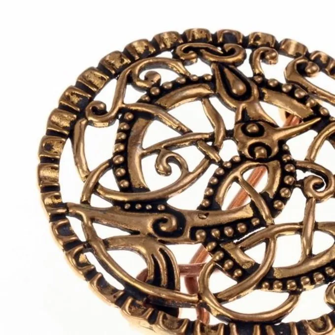 This Viking brooch is a replica of a 10th century original excavated in Pitney, England. The original is now part of the collection of the British museum in London. The brooch is made in the Urnes style but also has clear Anglo-Saxon elements. The Midgard snake is depicted on the brooch.