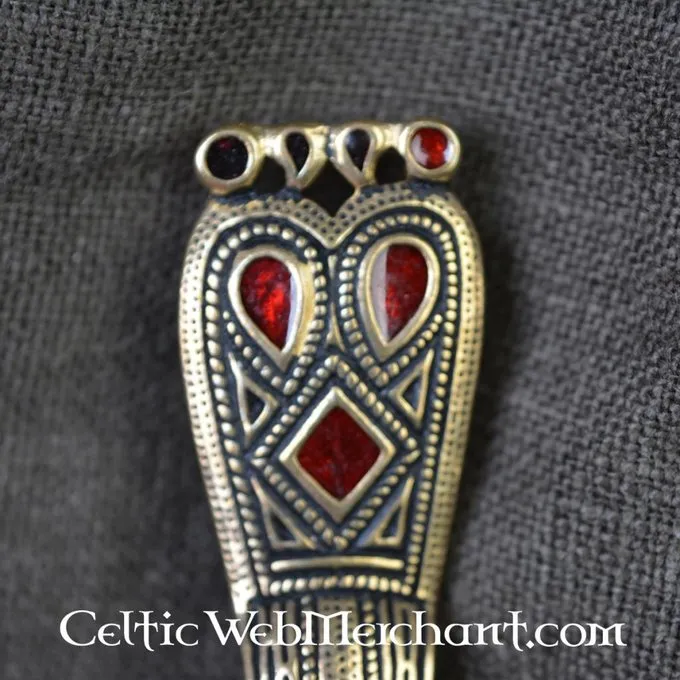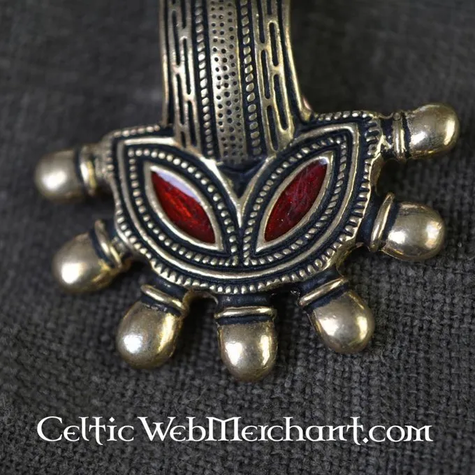 This early medieval bow fibula is a replica of a 6th century original found in Kent, England. Similar enameled bow fibulae were worn by all Germanic tribes, such as the Merovingians, Franks, Langobards and Friesians. The original of this fibula was likely made in South-Germany and arrived in South-England via trade. The original is currently part of the collection of the British Museum in London.