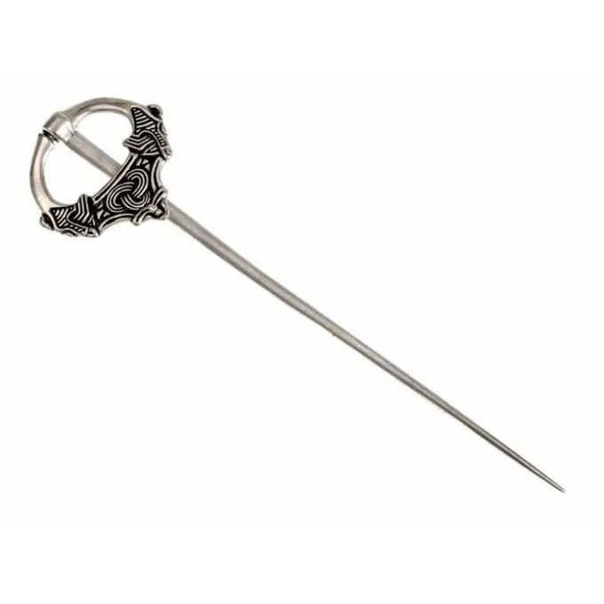 This Viking brooch is a replica of a 9th century original found in Oppland in Norway. The brooch shows clear similarities with bracelets worn by the Gaels around the same time in Ireland. Often the pins of these brooches were so long that in Old Irish Law there was a fine for accidentally injuring other people with these pins. This brooch may have been plundered during one of the many Viking lootings at Irish monasteries.