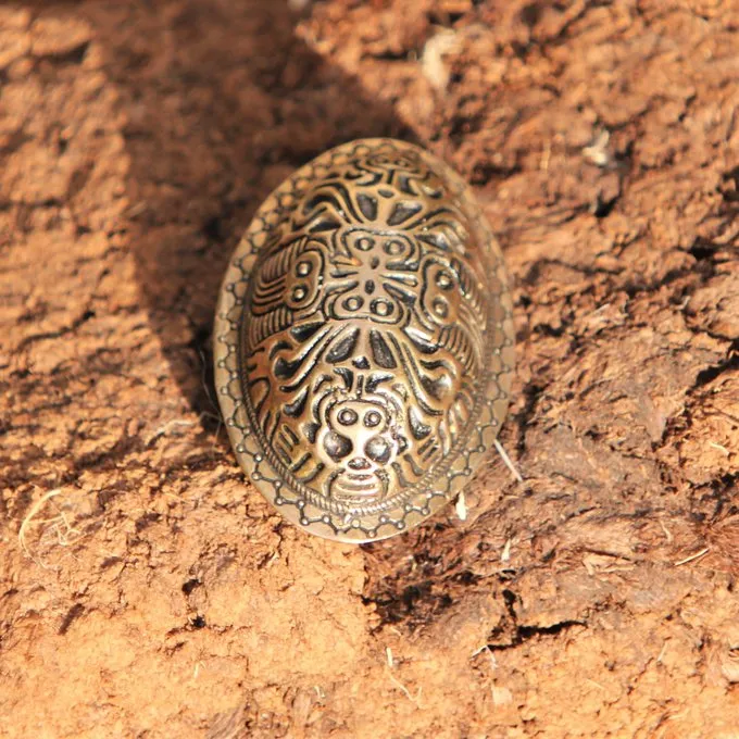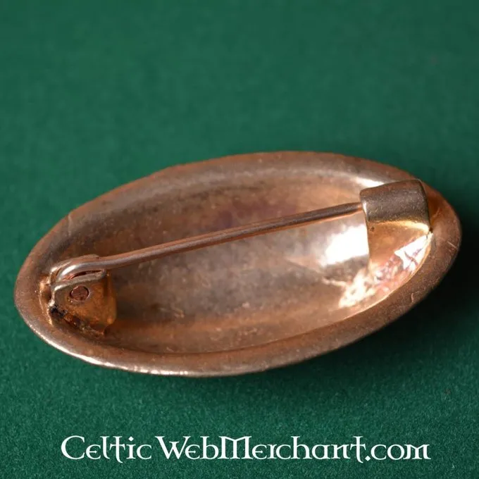 This brooch is handmade of bronze and measures 6 x 3,8 x 1,8 cm.